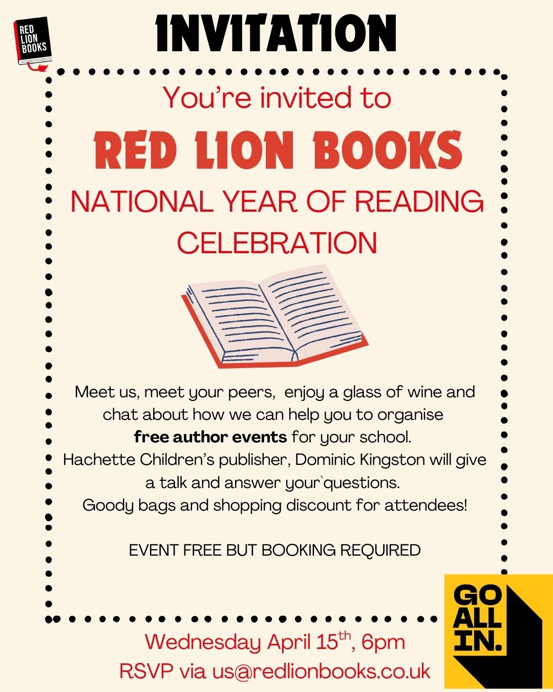 The idea is that you’ll meet us, meet your peers and also meet childrens’ publisher, Dominic Kingston from Hachette who’ll give a short talk about how schools can access free events and activities. Attendees will receive a goody bag and a shopping discount, as well as a glass of wine.